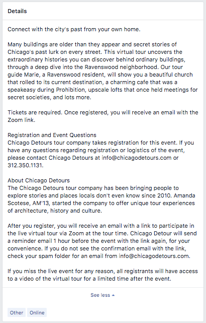 Now that many events are held virtually, the description is also a great way to clarify the entire registration process, including what kinds of confirmation and calendar invites guests can expect, and what content will be available on-demand after the event, as seen in the description of a virtual Chicago tour above.