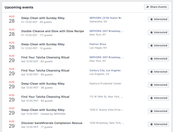List upcoming events in advance to build a fully fleshed-out calendar on the Events tab of your Facebook Business Page. This can help you organize recurring events, such as weekly or monthly chats and seminars, or highlight events taking place in multiple franchise locations, like in the above example from Sephora.
