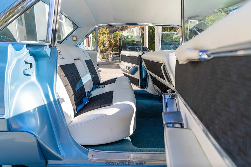 Cadillac leaned hard into its “Standard of the World” branding, and it shows in the exterior design. Silverado Blue suits the six-window hardtop body style, playing well with the restrained fins, crisp character lines, and brushed metal accents. It’s a color you don’t see much today, but it fits right into the pastel-heavy palette of the time period. Chrome trim runs nearly the full length of the car, wrapping around the body sides, windows, and bumpers. The rear spats cover the back wheels for a sleeker profile, while whitewall tires and stacked headlights reinforce the Cadillac image.