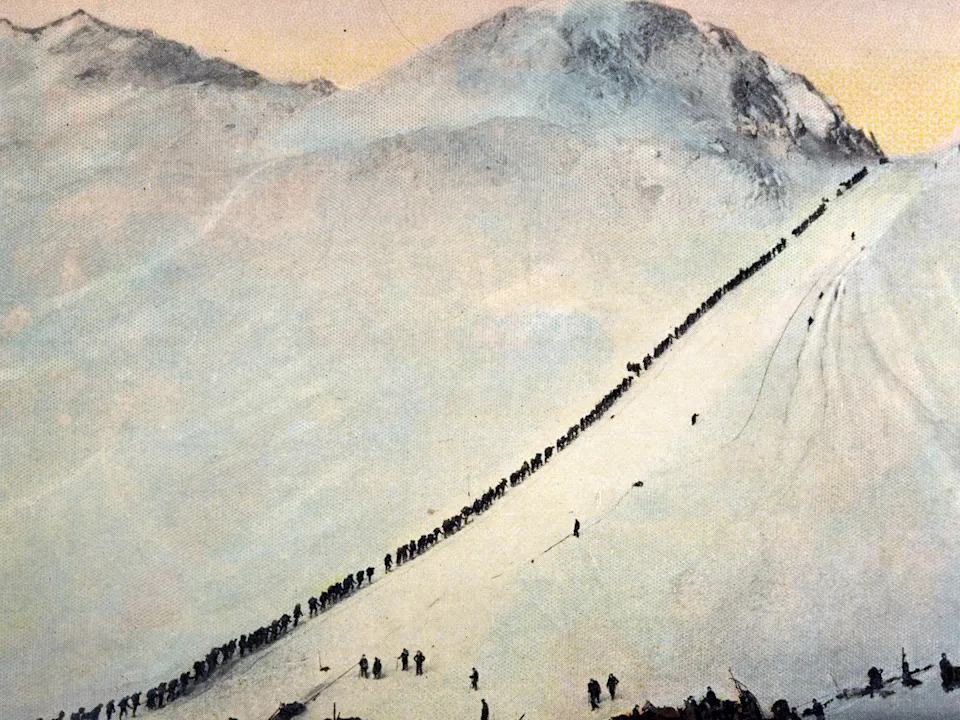 Long line of gold prospectors climb the stairs cut into the ice on the Chilkoot Trail through Chilkoot Pass during the Klondike Gold Rush. The temporary tent settlement called The Scales sits on a flat below the stairs, 1896.Michael Nicholson/Corbis/Getty ImagesSource: National Park Service