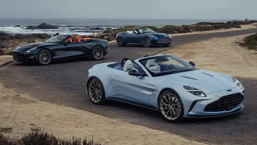 Shown Thursday at The Quail, A Motorsports Gathering, the Thrillseeker cars were configured by Q by Aston Martin and finished to echo the changing light over Carmel Bay. The set comprises a Vantage Roadster in Mako Blue meant to evoke dawn, a DB12 Volante in Seychelles Blue for the energy of afternoon sun, and a Vanquish Volante in Ultramarine Black to capture dusk. Each wears bronze wheels and side strakes, a bronze rotary center dial in the cabin, and comes with a color-matched luggage set intended to “evoke the amber sun of the Pacific Coast,” the company said.