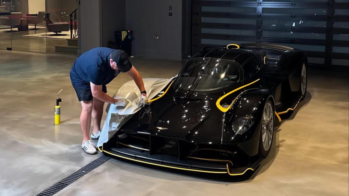 Tace first approached Young Film & Finish for a base coating to wrap the Valkyrie Spider in, atop which the rhinestones would be applied. Crystal Ninja then brought its team to the garage to hand apply more than 300,000 individual rhinestones, with 12 people working 12 hours a day for eight days straight, accumulating more than 1,500 hours of labor. Even the leading edge of the front spoiler, the engine intake, the outlets behind the front wheels, and parts of the steering wheel were covered in these rhinestones, which will obviously have a negative effect on aerodynamics. There's also a small weight penalty, the rhinesones adding around 35 pounds to the car's mass, but with 1,160 horsepower on tap from a 6.5-liter naturally aspirated V12 hybrid powertrain, the additional mass won't be evident from the driver's seat. However, there will likely be some additional wind noise. Not as much as there was when a semi truck sideswiped Ron's one-of-19 Ferrari F40 LM, but still.