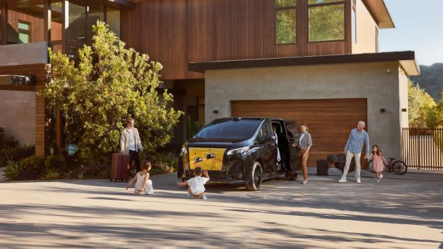 The FX Super One is an all-electric minivan with all-wheel drive, driver aids, and voice controls. Its interior features three rows of comfortable seating with a built-in massage function, a fold-down TV, and a mini fridge.
