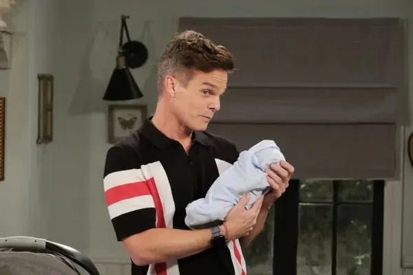 Leo (Greg Rikaart) has a lightbulb moment while taking care of Baby Tesoro.