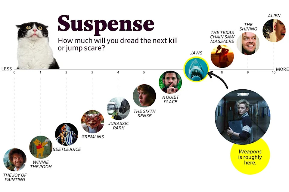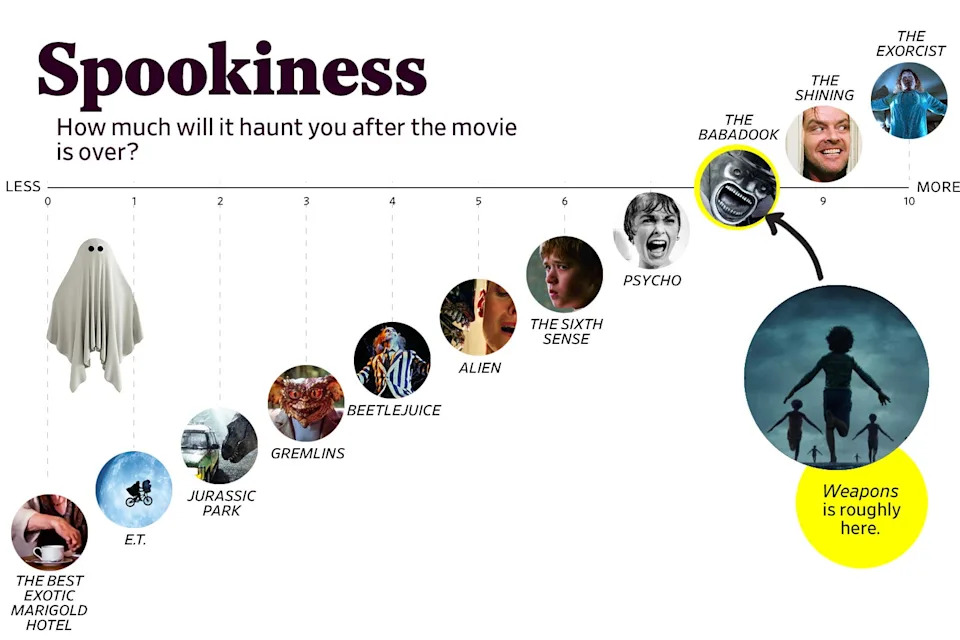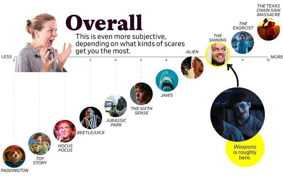 Photo illustration by Slate. Weapons photo by Warner Bros.Weapons may be too oblique for some people’s tastes, and too concrete for others’. It likely comes down to how you feel about its ultimate villain, and whether you prefer your horror social or supernatural. But it’s a creepy, nasty good time, with scares that will make audiences jump in their seats and a few that will leave them profoundly unsettled. (One thing’s for sure: You’ll never look at a dinner fork the same way again.) Either way, it’s worth gathering up your courage and stiffening your spine for what’s likely to be the most talked-about horror movie since Sinners. The Scaredy Scale’s got your back.
