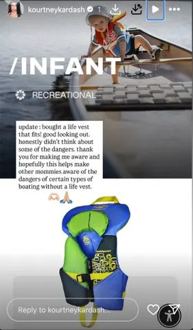 Kourtney Kardashian Barker's Instagram Stories post.Other images included in her Aug. 8 post indicated that Kardashian Barker was in Idaho, where it is required that children 14 years of age and younger must wear a life vest while on the water.