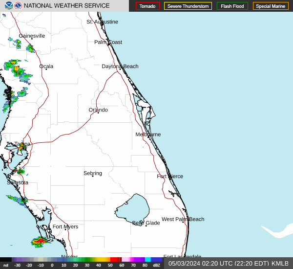 Shown is the National Weather Service-Melbourne radar, which shows conditions in real-time for the Space Coast, Brevard County, Orlando and other parts of Florida. The current date and time show up on the bottom right of this radar embed; otherwise, you may need to clear your cache.