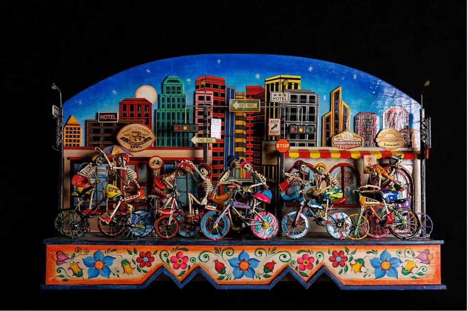 Picture the proportions of a shadow box: It could be the size of your hand, your head, or, in some cases, larger than your entire body. The exterior of this wooden box, often painted with vibrant floral flourishes, is deceptively simple. Pull open the two front doors and you’ll find an entire world within.