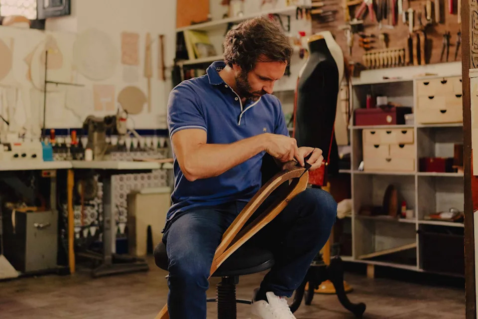 Javier Menacho’s atelier is a hive of quiet intensity. Upon walking in, I watch the leather artisan as he scores a perfect curve into a handbag panel with a compass. Soft piano music intermingles with the tweeting of sparrows outside, and my nose tingles with the heady scent of leather mixed with the musty perfume of incense burning on the windowsill. He's working on a clutch bag in bottle green leather, its surface embossed with geometric details inspired by Islamic art, gilded stars catching the light. The pattern, he tells me, draws upon the facade of La Giralda, the 12th century bell tower (and once a minaret) of Seville’s cathedral, as well as a tile from the ceramics neighborhood of Triana, and a floral Baroque motif. This is a man who clearly cares about details…