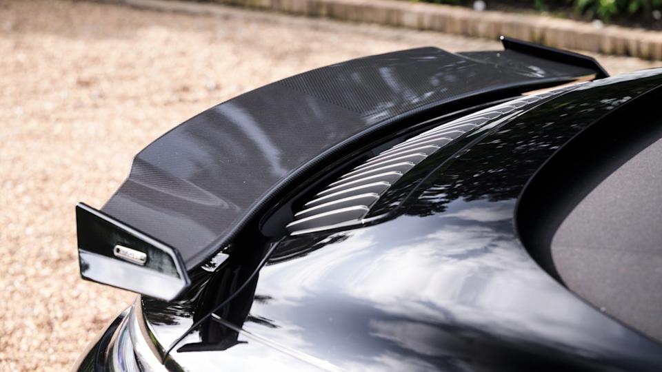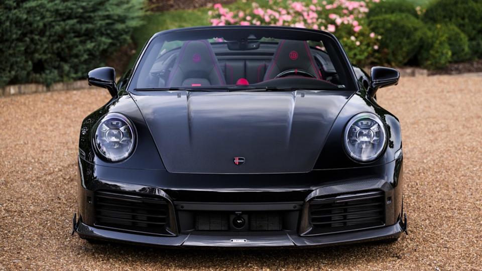 Brabus retained the eight-speed PDK dual-clutch transaxle, all-wheel drive system, and Porsche Dynamic Chassis Control suspension with front-end lift. The hood, front bumper trim, side skirts, engine cover, front and rear spoilers, and rear diffuser are all carbon fiber under Jet Black Metallic paint. The car also wears center-locking Brabus wheels, sized 21 inches in front and 22 inches in the back, with Michelin Pilot Sport 4S tires.