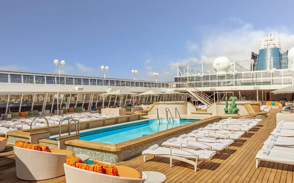 The pool deck on board the Crystal Serenity ship - Crystal CruisesIn Menorca’s Mahón, we sailed into one of Europe’s largest natural harbours, almost scraping the sides of the Isla del Rey (now home to a Hauser & Wirth gallery) and moored close enough to the distillery at Xoriguer to imagine a faint whiff of juniper.