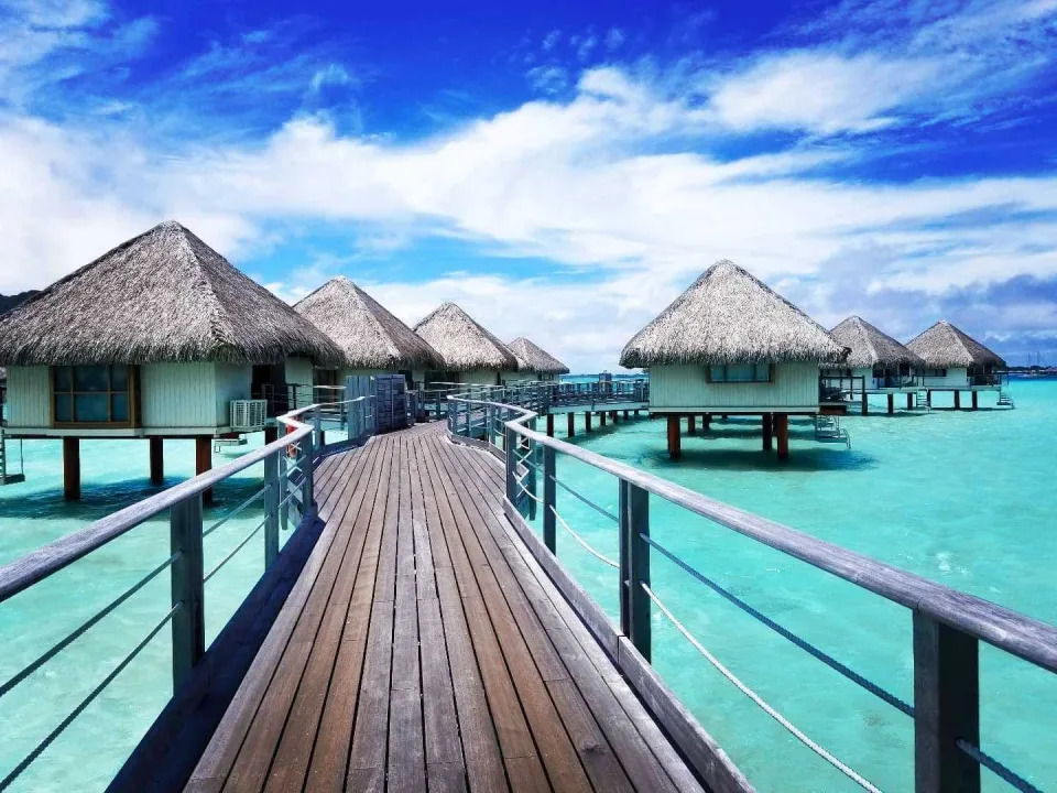 Formed by an extinct volcano, Bora Bora is surrounded by a calm turquoise lagoon that's basically a huge wading pool. I remember marveling at rows of romantic bungalows with thatched roofs and glass floors overlooking the water.