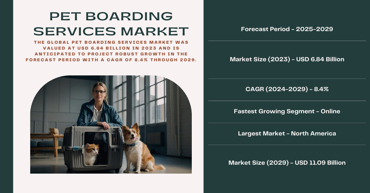 According to a TechSci Research report, “Global Pet Boarding Services Market - Global Industry Size, Share, Trends, Competition Forecast & Opportunities, 2029F,” the global pet boarding services market was valued at USD 6.84 billion in 2023 and is anticipated to grow at a compound annual growth rate (CAGR) of 8.4% through 2029.